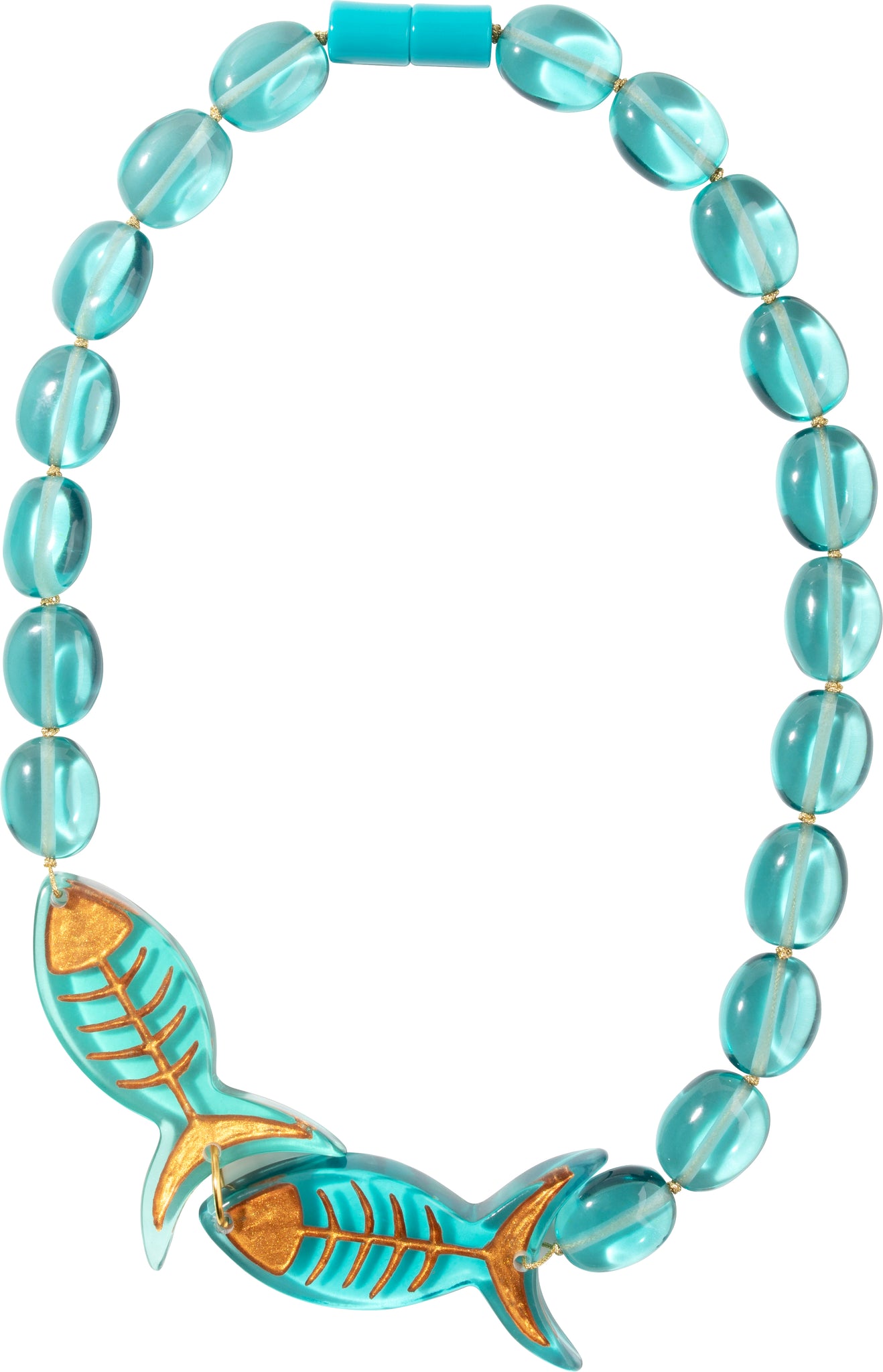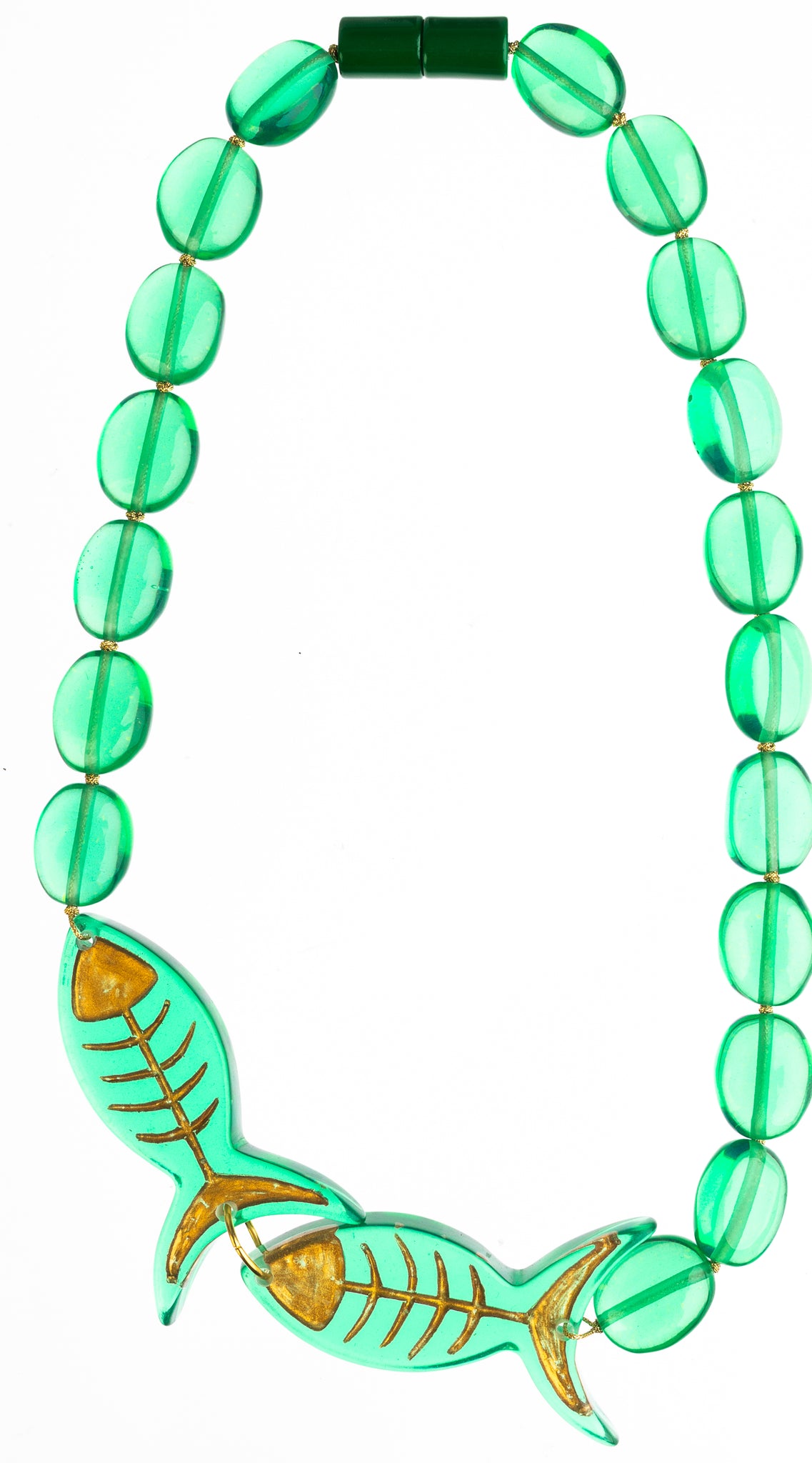 Introducing the PISCE Green Resin Necklace by ZSISKA DESIGN, a captivating addition to any jewellery collection. This handmade piece features a unique blend of traditional glass-like beads and eye-catching fish motifs, perfect for adding a touch of whimsy to your outfit.